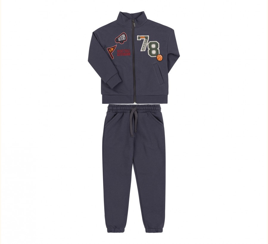 Костюм для мальчика, джемпера и брюки. Застежка центральная "молния". Трикотаж шардон, спереди вышивка. Воротник - стойка, рукав ушивной, длинный, по бокам джемпера кармана. Брюки с карманами, пришивной пояс на резинке.